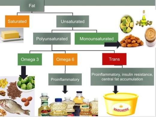 3. Increase good fat intake: The human body needs fat to function, plus it makes us feel full after eating. See my article Nutrition 101: Macronutrients (carbs, fat and protein) The goal is to not eliminate fat, but to focus on improving the fat quality. Your body does different things with different types of fat from food. Omega 3 is a good dietary fat that is turned into the good fat, HDL (remember HDL cleans up the arteries, that is why we treat high fat levels with Omega 3 supplements!). Omega 3 is found in fish, seafood, and plants such as flax, chia, and walnuts. This is why fish and seafood is recommended in a heart healthy diet! Monounsaturated fat is found in things like olive oil, and it is not turned into bad fat in the blood. This is why the mediterranean people are heart healthy! Omega 6 fat is found in processed vegetable oils, such as canola. It is not as healthy as omega 3 fat, so we should try to eat less of it. Unfortunately omega 6 is found in most American processed foods. Saturated fat is the fat found in animal products such as dairy and fatty meat such as red meat, and should be eaten less than monounsaturated and omega 3 fat. Trans fat is something that humans made for processed foods and it causes bad fat and inflammation, so avoid trans fat in processed foods.